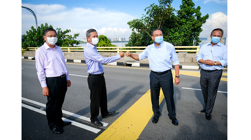 7月26日,馬來西亞外長希山慕丁(右二)和新加坡外長維文(左二)在連接兩國的新柔長堤上會面,並就符合條件的兩國公民跨境通行達成相關協議。圖為兩位外長用碰拳代替握手互致問候。(中新社發 馬來西亞外交部 供圖 )