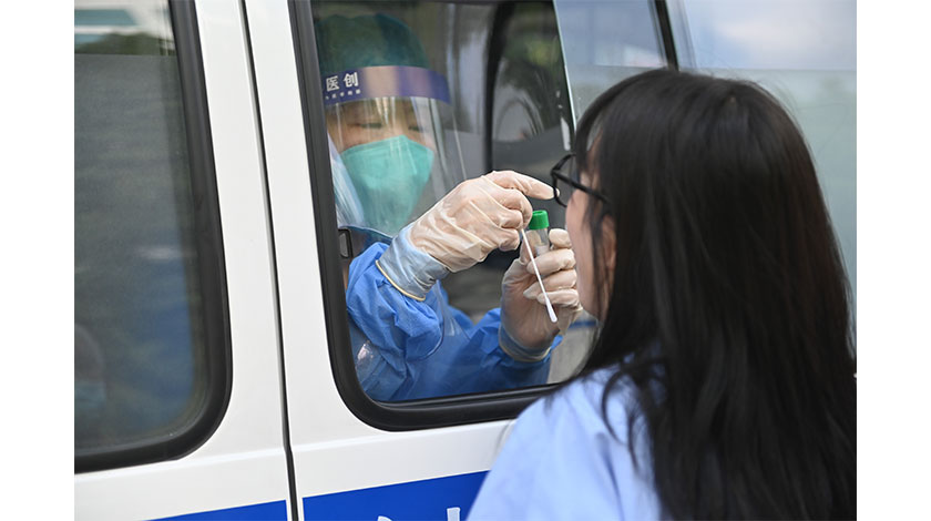 7月28日,一輛車身上印著『瀋陽市第四人民醫院核酸檢測流動車』字樣的醫療救護車,停靠在瀋陽市府廣場為市民進行核酸檢測。(中新社記者 于海洋 攝)