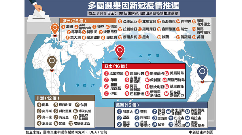 據國際民主和選舉援助研究所(IDEA)網站發佈的數據,從2月21日至7月26日,全球至少68個國家和地區因新冠疫情而推遲選舉,其中至少有24個國家和地區決定推遲全國性選舉或全民公投。(中新社發 陳沫 製圖)