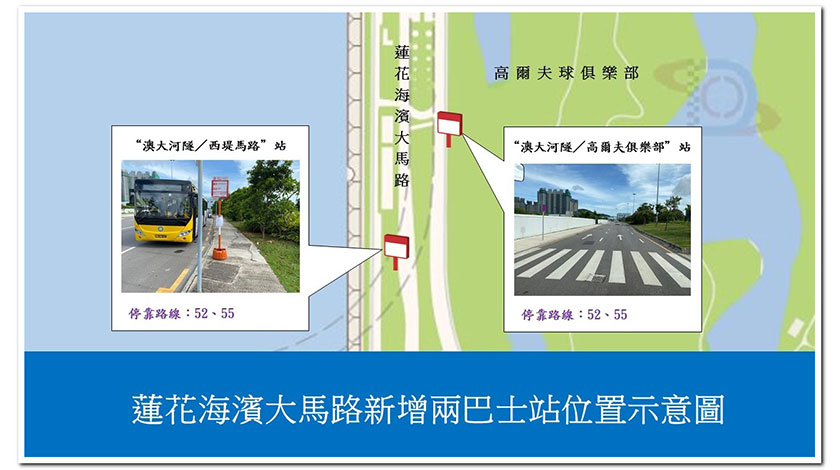 【特訊】由8月18日(周二)首班車起,交通事務局於蓮花海濱大馬路增設“澳大河隧/高爾夫俱樂部”站及“澳大河隧/西堤馬路”站,供52及55路線停靠,以提升巴士服務。