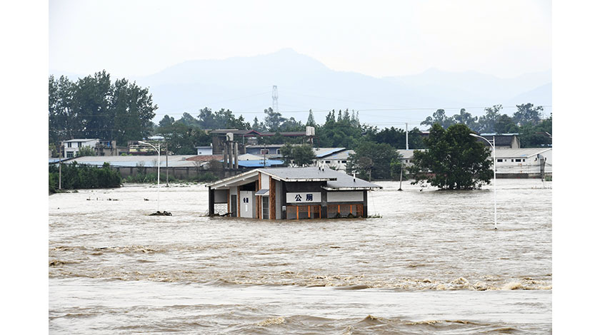 17日,四川成都金堂縣遭遇超50年一遇洪水,沱江幹流三皇廟水文站出現洪峰水位446.55米,洪峰流量8100立方米/秒,超警戒水位6.0米,超保證水位3.71米,重現期為超50年一遇。圖為洪峰過境金堂。(中新社記者 安源 攝)