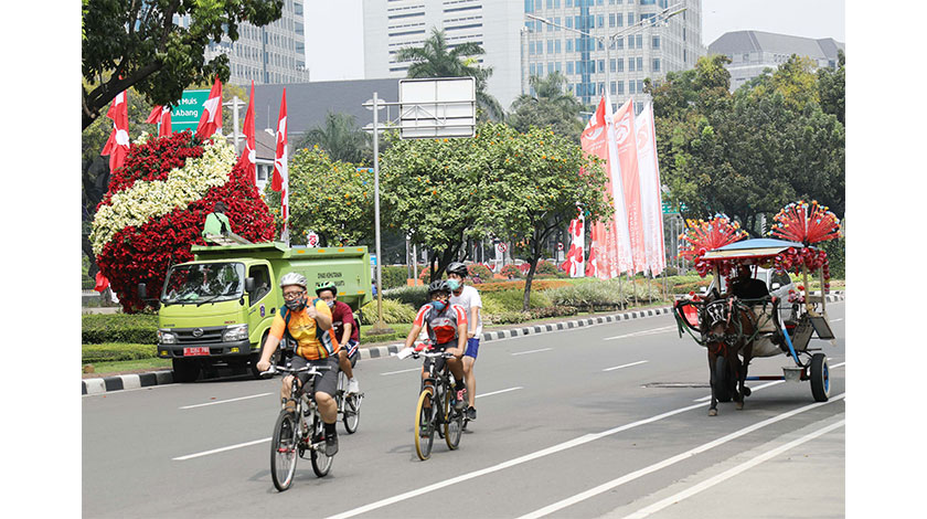 17日是印度尼西亞共和國成立75周年紀念日,因為新冠肺炎疫情肆虐,該國取消了原定的許多慶祝活動,僅保留少數人員參加的昇旗儀式。圖為幾位市民在雅加達省府大道騎行。(中新社記者 林永傳 攝)