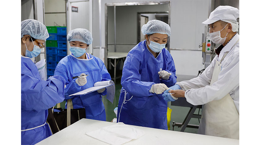 18日,上海市黃浦區疾控中心工作人員對上海澳辰食品有限公司工作人員所戴的手套進行採樣。近日,上海市疾控部門加強對電商平臺、大型超市、農貿市場的進口冷鏈食品的監測和調查,保障食品安全,防範疫情輸入風險。(中新社記者 殷立勤 攝)