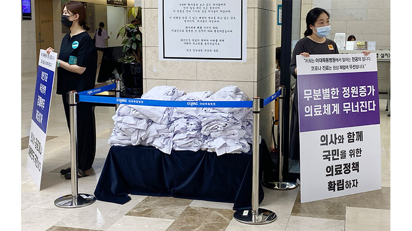 26日,韓國首爾木洞地區一家大型綜合醫院內,醫生脫下的白大褂擺在大廳桌上,一旁有罷診醫生舉著標語抗議。由於反對醫改政策,韓國醫學界26日起集體罷診。(中新社記者 曾鼐 攝)