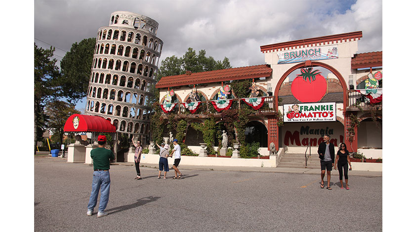 當地時間8月29日,加拿大多倫多市民眾在一家建築外形仿造比薩斜塔的意式自助餐廳門前拍照留念。這家擁有25年曆史、在當地頗具知名度的意式自助餐廳,因不敵新冠疫情衝擊,在當天正式結業。(中新社記者 余瑞冬 攝)