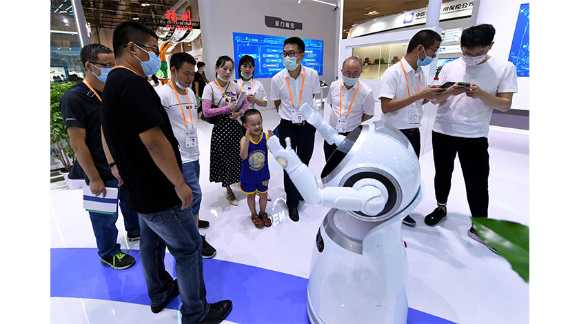9日在廈門舉行的2020廈門國際投資貿易洽談會(簡稱『廈洽會』)上,人工智能設備吸引觀眾駐足觀看。本屆『廈洽會』展覽總面積約11萬平方米,分為投資主題館、產業招商館兩大部分,共設置16個專業展區。圖為可以與人對話交流的機器人。(中新社記者 王東明 攝)