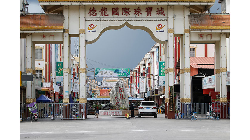 22日,雲南省瑞麗市,德龍國際珠寶城已開門迎客。9月21日22時起,瑞麗市解除城區居家隔離,其中奧星世紀一期、二期小區封閉管理住戶開展第二次核酸檢測無異常後,于26日解除居家隔離。(中新社記者 蔣啟明 攝)