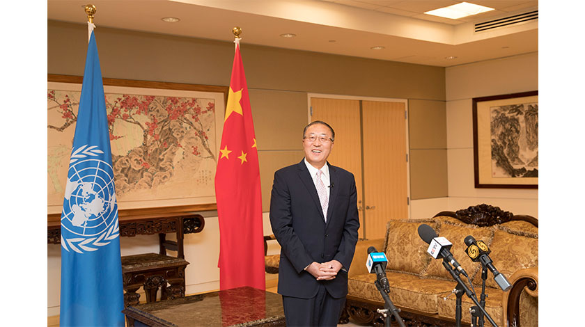 當地時間9月21日,中國常駐聯合國代表張軍在紐約就中國國家主席習近平在聯合國成立75周年紀念峰會上發表重要講話向記者吹風。(中新社記者 廖攀 攝)