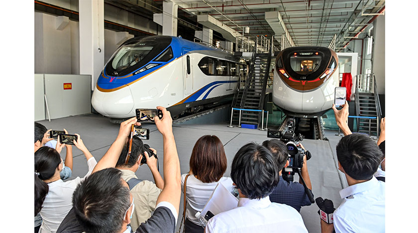 25日,由中車株洲電力機車有限公司製造的廣州地鐵十八(左)、二十二號線(右)首列列車在廣東省廣州市陳頭崗停車場交付。廣州地鐵十八、二十二號線是時速160公里的全地下市域快線,線路建成後將連通廣州主要交通樞紐,實現南沙自貿區25分鐘到達廣州南站、30分鐘到達廣州東站的時空目標。(中新社記者 陳驥旻 攝)