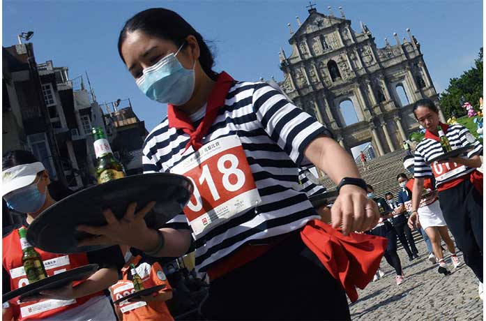 傳統托盤比賽在昨午舉行,超過九十名參賽者分別代表澳門二十間酒店及餐廳等作賽,他們手持載有啤酒的托盤從大三巴牌坊出發,以最快速度到達議事亭前地的終點。
