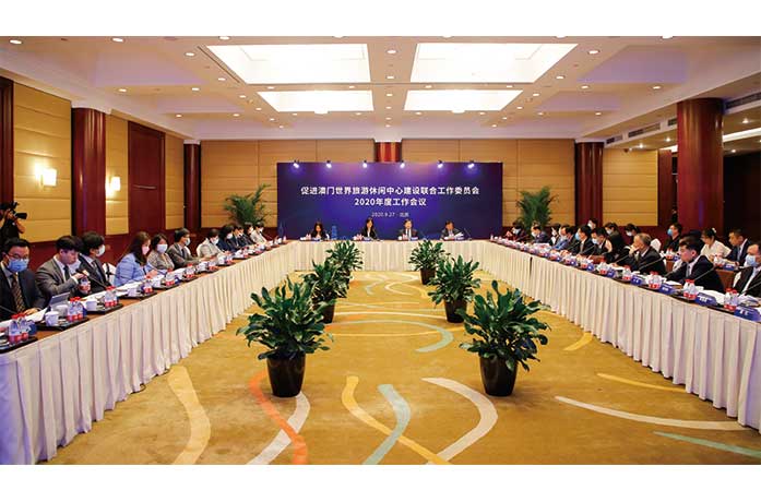 【特訊】 “促進澳門世界旅遊休閒中心建設聯合工作委員會”(下稱:聯委會)昨在北京舉行2020年度工作會議,國家文化和旅遊部、澳門特別行政區政府社會文化司及中央人民政府駐澳門聯絡辦公室等多個相關單位的領導和代表出席,就多項議題進行溝通和工作磋商,今年加上有關疫情防控措施及恢復文化和旅遊活動等內容。