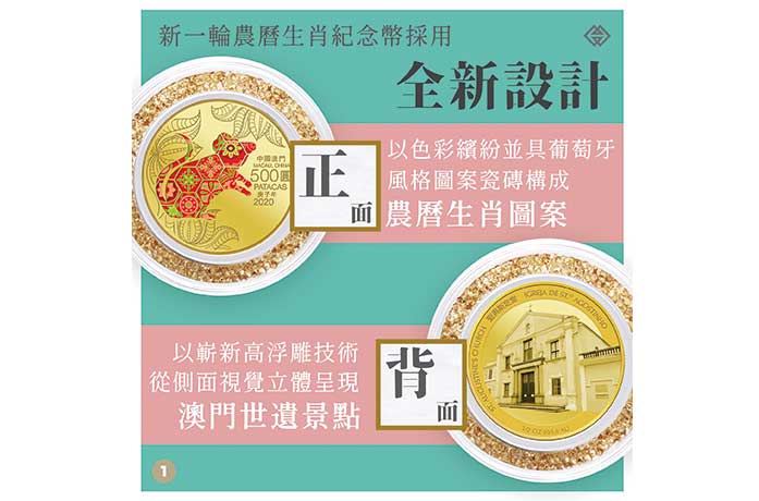 新一輪農曆生肖紀念幣採用全新設計,正面以色彩繽紛且具葡萄牙風格的圖案瓷磚構成農曆生肖圖案,背面則以嶄新高浮雕技術,從側面視覺立體地呈現澳門世界文化遺產景點。與上系列相近,是次發行的鼠年及牛年生肖紀念幣將包括壹安士及五安士精裝銀幣,而精裝金幣則由過往的零點二五安士加重至零點五安士,三款紀念幣的售價分別為1380澳門元、8800澳門元及16800澳門元。