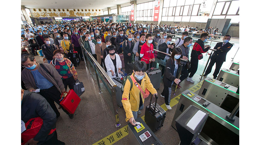 9月30日,山西太原火車站,旅客在候車室排隊檢票乘車。國慶中秋假期將至,山西太原火車站迎來客流高峰。(中新社記者 張雲 攝)