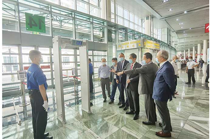 9月30日,上午澳門國際機場專營股份有限公司(CAM)董事會主席馬有恆,執行委員會主席鄧軍博士、執行董事:朱丹寧、簡焯坤、李時泰及梁以恆等一行到澳門國際機場,主要檢查按照衛生局指示在候機樓新安裝的四台測溫安檢門,詳細查看出入口流程安排、相關張貼指引和資訊的清晰度,希望能做好防疫的同時,亦可盡快疏散控制人流。四台測溫安檢門分別安裝於候機樓離境層一號、二號和十四號出入口,以及候機樓入境層南北兩端出入口,為進入候機樓的所有人士測量體溫和檢查健康碼,其他出入口暫停使用。