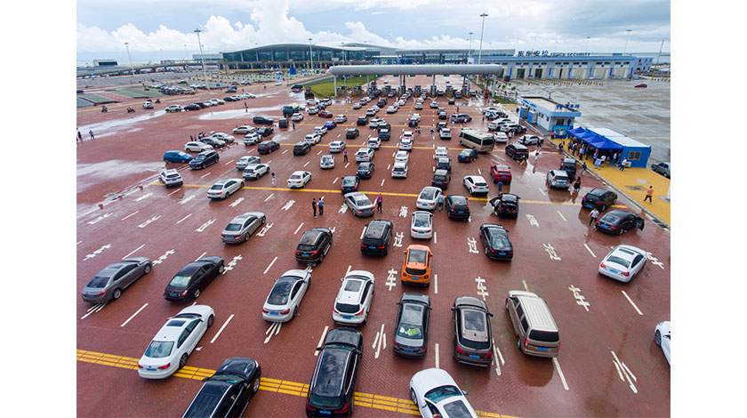 10月 1日,中秋國慶假期首日,大批自駕遊車輛搭乘瓊州海峽客滾船前往海南度假。據瞭解,自9月30日0時-10月8日24時,瓊州海峽實施非瓊籍、非運營小客車免費過海政策,吸引海南省外自駕遊遊客來瓊旅遊。圖為廣東徐聞港碼頭,過海車輛排隊購票。(航拍圖)(中新社記者 駱雲飛 攝)