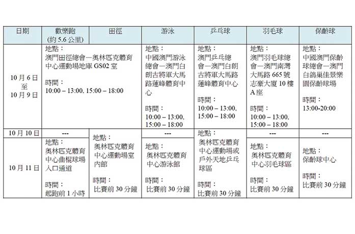是次活動得到廣大市民支持,報名情況踴躍。已報名的市民可體育局網頁連結(http://www.sport.gov.mo/zh/macaosportsgames)瀏覽比賽賽程。請所有參加者了解各自比賽時間,並按章程規定於賽事舉行前到達比賽場地進行檢錄及報到,有關運動員證及號碼布可按以下日期及地點領取(如圖):