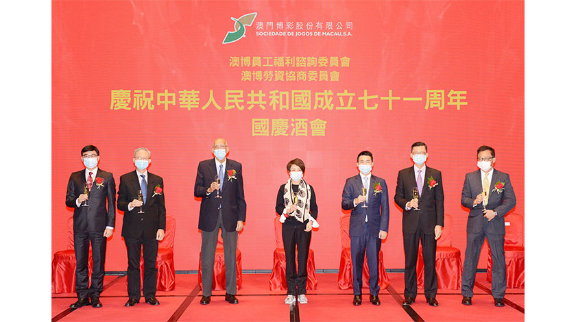 隨後,澳博董事和管理層與在場員工共同舉杯,祝願祖國繁榮昌盛、國泰民安,澳門經濟發展、和諧穩定。澳博嚴格遵守特區政府的防疫措施,鑒於疫情關係,大幅縮減了今年國慶酒會的規模。國慶酒會的内容將通過錄影方式稍後於員工後勤休息區播放,與員工共賀國慶,厚植愛國情懷。