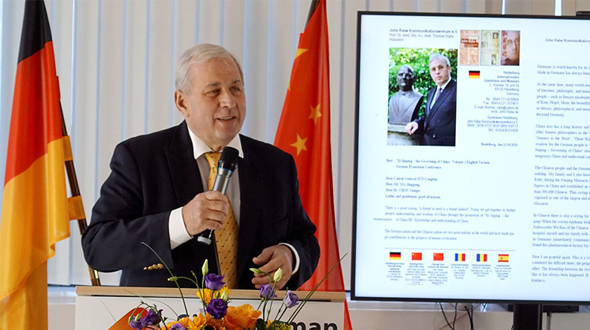 近日,『南京好人』約翰•拉貝之孫托馬斯•拉貝日前接受中新社記者專訪,托馬斯•拉貝的祖父約翰•拉貝曾是德國西門子公司在華代表。侵華日軍發動南京大屠殺期間,約翰•拉貝召集一批正直的國際人士建立了國際安全區,拯救了約25萬中國人的生命。今年1月底,德國境內確診首例新冠病例。3月,德國迎來疫情第一波高峰,口罩等防疫物資一時間十分緊缺。令托馬斯•拉貝難忘的是,在疫情暴發後,他本人收到了來自北京和南京等地多家機構捐贈的防疫物資。這當中最『特殊』的是由中國駐德國大使館轉交給他的一批防疫用品。資料圖為托馬斯•拉貝日前在海德堡代表約翰•拉貝交流中心接受中德科教園向其捐贈6000祗口罩。(中新社發 中德科教園 供圖)