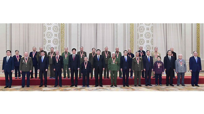 10月23日,紀念中國人民志願軍抗美援朝出國作戰70周年大會在北京人民大會堂隆重舉行。會前,習近平等領導同志會見『中國人民志願軍抗美援朝出國作戰70周年』紀念章獲得者代表,並同大家合影留念。(新華社記者 謝環馳 攝)