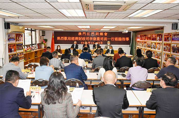 【特訊】經濟財政司司長李偉農於10月21日前率轄下多個局領導及辦公室顧問,到訪江門同鄉會,聽取該會對經濟財政範疇的施政意見,獲該會會長甄瑞權、理事長劉家裕、監事長梁耀宗及立法議員兼副會長麥瑞權等負責人接待,雙方就疫後政府幫扶中小企紓困及促進經濟復甦、旅遊酒店及餐飲零售業面臨困境、人力資源、入境及賭場防疫措施以及融入大灣區建設等多方面問題交換意見。