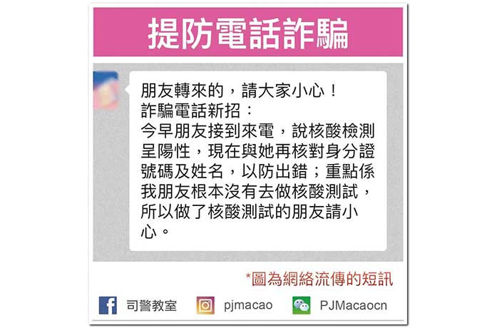 【又訊】司法警察局接獲多名司警局大廈防罪之友會員反映,表示昨日在某社交通訊平台流傳一則懷疑電話騙案的新手法,內容指有人收到電話表示事主核酸檢測呈陽性,要求提供個人身份資料以便核實。