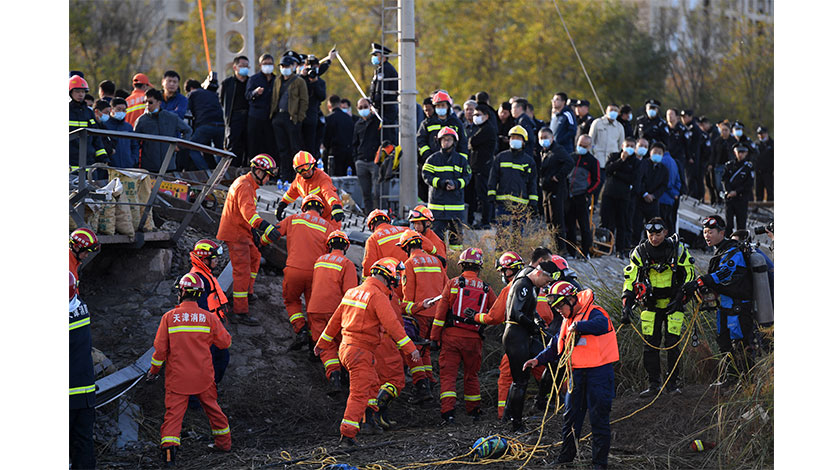 11月1日,救援人員在事故現場進行救援工作。當日9時許,天津南環鐵路維修有限公司在南環鐵路橋梁維修過程中發生坍塌事故。截至記者發稿時事故已造成7死5傷。新華社發(趙子碩攝)
