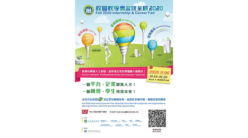 本次實習就業展亦歡迎廣大市民、各高校學生前來參與,如有任何查詢,可致電澳科大創業就業發展中心,電話:八八九七 二八八一。詳情可瀏覽網站:https://www.must.edu.mo/cecp/fall-2020-internship-and-career-fair-20201106。