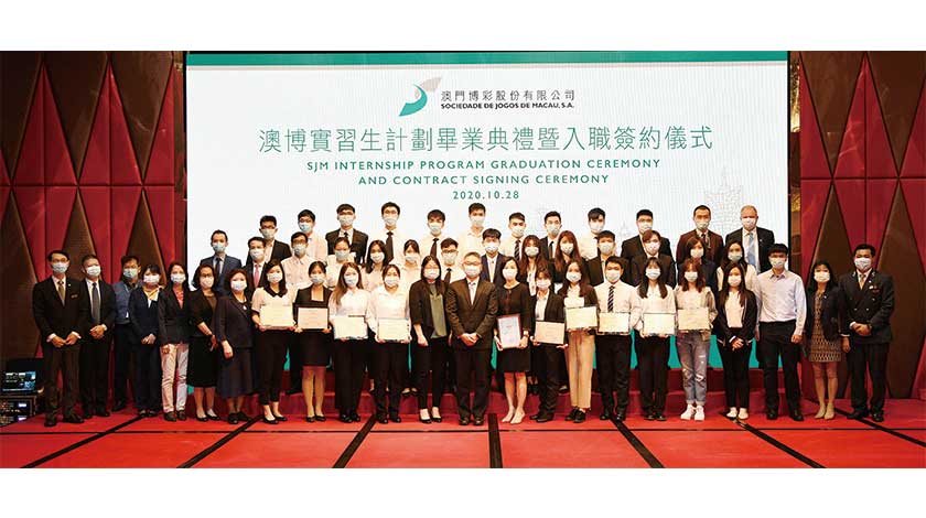 澳博亦參與勞工局的「疫境自強‧職出前程」職場體驗計劃,全力支援應屆畢業生就業。在為期三個月的實習培訓中,28名應屆畢業生獲安排於澳博不同的部門工作,從中獲取職場體驗,增進專業技能、知識及溝通技巧等,為將來就業做好準備。計劃於上月底完成,澳博向所有實習生發出入職邀請,當中22名接受了公司聘用。澳博實習生畢業典禮暨入職簽約儀式於10月28日假新葡京宴會廳舉行,勞工局副局長陳元童、就業廳廳長孟瑞怡出席主禮。