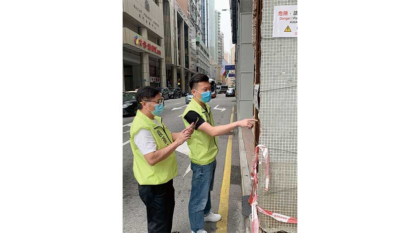 【特訊】日前,新口岸區有大廈由於公共部分樑柱日久失修,出現斷裂及有碎石塊脫落。民眾建澳聯盟副理事長袁漢均及蔡思偉接獲相關業主求助後,隨即前往現場了解及跟進,並聯繫相關部門到場協助處理情況,避免問題惡化。