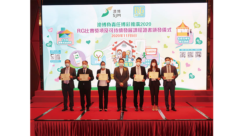 澳博昨假新葡京酒店宴會廳舉行負責任博彩(RG)推廣二零二零之RG比賽獎項及可持續發展課程證書頒發儀式,共有六十六名學員獲頒證書;並邀請博彩監察協調局研究調查廳廳長陳玉雪、社會工作局防治問題賭博處代處長原健鏘、中聯辦經濟部處長級助理司晨、澳門工會聯合總會會長何雪卿、澳門大學博彩研究所所長馮家超、澳門理工學院博彩教學暨研究中心主任王長斌、澳門負責任博彩協會會長關偉霖、以及澳博常務董事梁安琪、董事何猷亨,秘書長官樂怡及澳博各部門主管出席見證。