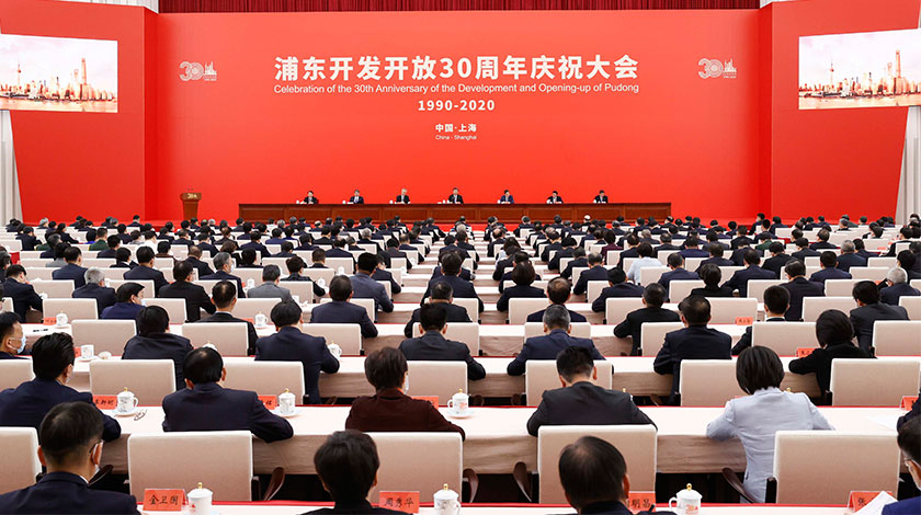 11月12日,浦東開發開放30周年慶祝大會在上海市舉行。中共中央總書記、國家主席、中央軍委主席習近平在會上發表重要講話。(中新社記者 盛佳鵬 攝)