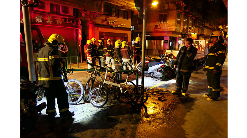 昨日凌晨約二時半,消防接報墨山街十七號華輝樓對開行人路有紙皮著火,波及路旁的電單車。消防員抵至見有紙皮仍著火燃燒,火舌波及路邊鐵欄停泊的兩部單車,消防員立即拖喉撲火,火舌迅速被撲熄。