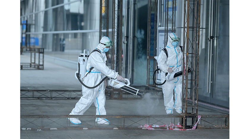 11月18日,廣西南寧國際會展中心內,工作人員對展館進行全面消殺作業。據瞭解,第17屆中國—東盟博覽會將於11月27日至30日在廣西南寧舉辦。(中新社記者 俞靖 攝)
