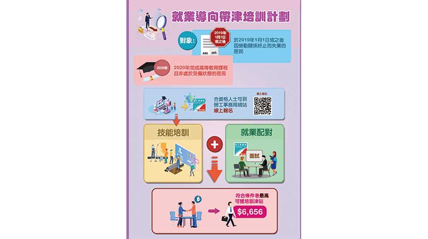 勞工局將因應巿場需求,每月推出課程接受報名。“就業導向帶津培訓計劃”由“技能培訓”及“就業轉介”兩部份組成,學員完成課程及配合就業轉介,可獲得最高6656澳門元的培訓津貼。有關計劃的對象為澳門居民,且於2019年1月1日或之後因勞動關係終止而失業,或非處於受僱狀態的2020年高等院校畢業生。