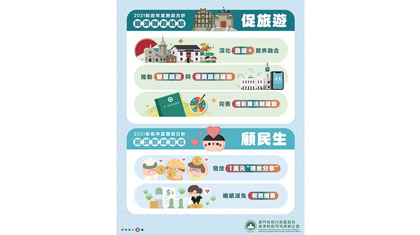 其他在旅遊、就業和經濟適度多元也作出不少篇幅作介紹。他指出,明年是國家「十四五」規劃開局之年,特區會呼應國家經濟戰略新部署,積極協助企業參與、了解並把握好其帶來的新機遇。續推大灣區建設,加強與廣東省合作,深化與珠海合作關係,特別是將積極參與橫琴粵澳深度合作區建設,讓合作區可有力支撐澳門經濟適度多元發展。
