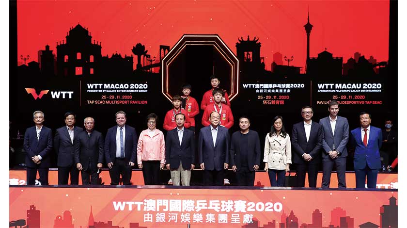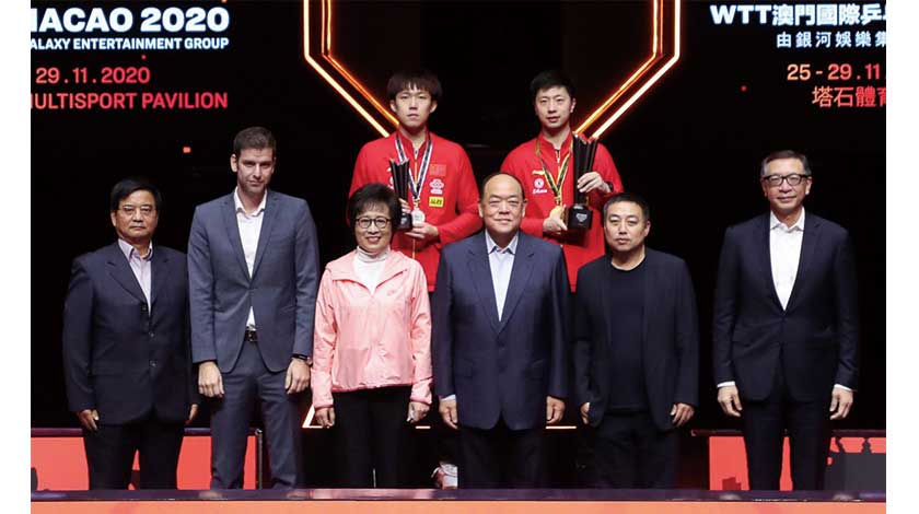 【特訊】由澳門特別行政區政府體育局及世界乒乓球職業大聯盟(WTT)主辦、澳門乒乓總會協辦的「WTT 澳門國際乒乓球賽 2020 ─ 由銀河娛樂集團呈獻」今日 (29日)在塔石體育館決出男女子冠軍。馬龍孫穎莎均以局數5:1擊敗王楚欽及陳幸同。賽後由行政長官賀一誠等嘉賓頒發獎項。