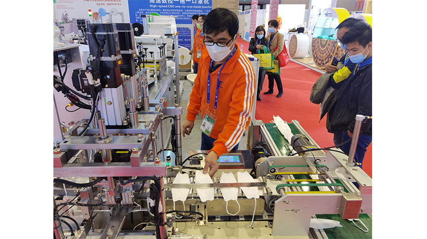 11月29日,正在廣西南寧舉行的第17屆中國-東盟博覽會上,全自動口罩機吸引眾多客商。該機器占地不到10平方米,每分鐘可生產160片口罩。據參展企業介紹,該設備疫情期間大量出口東盟、歐盟、韓國等國家和地區。(中新社記者 蒙鳴明 攝)