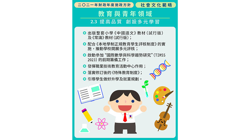 完善法律法規方面,將優先起草《非高等教育私立補充教學輔助中心通則》。將制定的行政法規,涉及醫療補貼計劃、各類學生學習用品津貼及學費津貼、防疫接種制度、職業技術教育、澳門旅遊學院及澳門理工學院人員通則等。