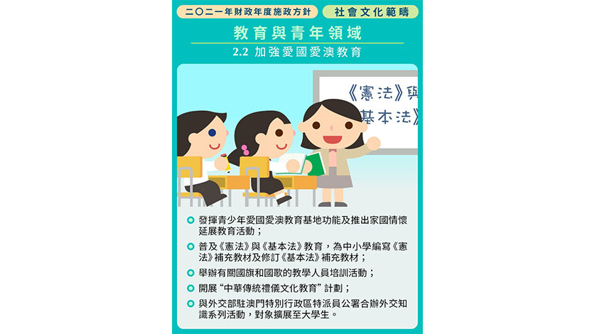 教育方面,將協調各高校在不影響本地學生就讀的前提下擴大招收外地學生的比例,促進科技成果的應用和轉化。推出青年領袖人才培訓計劃,編寫《憲法》補充教材,修訂《基本法》補充教材等。