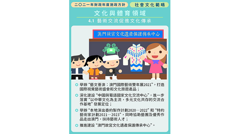 引導文化產業發展方面,將頒發首屆「優秀文產企業獎」及「優秀文產項目獎」,鼓勵業界增強競爭力;同時,推出支持本澳影視業措施,促進本澳影視製作水平提升等。