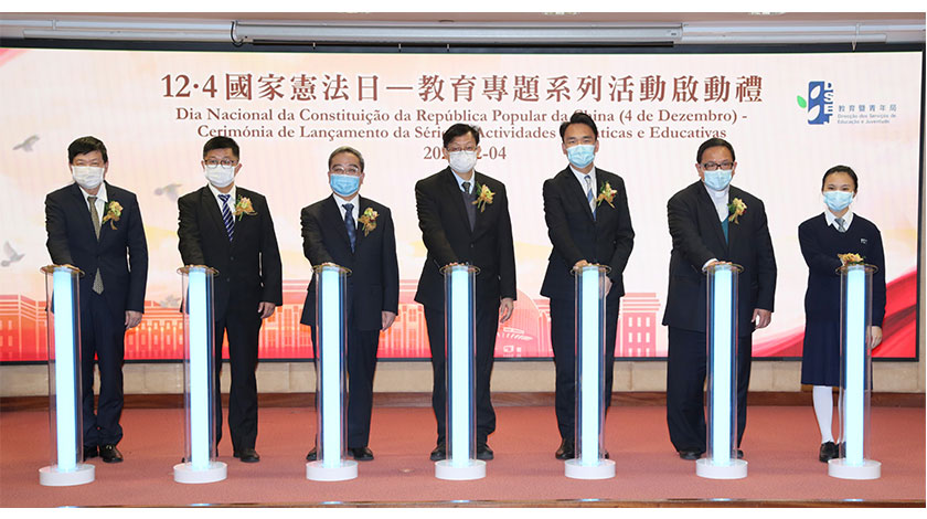 【特訊】為慶祝國家憲法日,教育暨青年局於本年11月30日至12月11日期間舉辦國家憲法日─教育專題系列活動,並於昨日國家憲法日當天於教青局一樓仲尼堂舉行國家憲法日-教育專題系列活動啟動禮(見圖),出席嘉賓包括教青局局長老柏生、中央人民政府駐澳門特別行政區聯絡辦公室教育與青年工作部副部長苟人民、教青局副局長龔志明、澳門中華教育會理事長鄭洪光、澳門天主教學校聯會會長周伯輝、澳門公職教育協會會員大會主席鄭衛星、學校校長及代表。