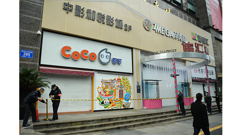 12月8日,四川成都,一新冠肺炎確診患者去過的上東大街一商場停業,工作人員拉起警戒線。據成都市衛健委當日上午通報,當日0時至6時,成都新增3例新冠肺炎本土病例。(中新社記者 劉忠俊 攝)