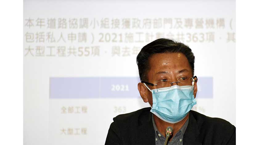 交通事務局昨午舉行「二零二一年道路工程計劃新聞發布會」。因應特區政府二零二一年度施政重點中適當擴大公共投資,加大基建投資,促進投資需求。道路工程協調小組至今已接獲三百六十三宗由政府部門及公共事業機構提出的明年道路工程施工計劃,較今年增加二成一;其中明年涉及主幹道的大型工程共五十五宗,數量與今年相同。