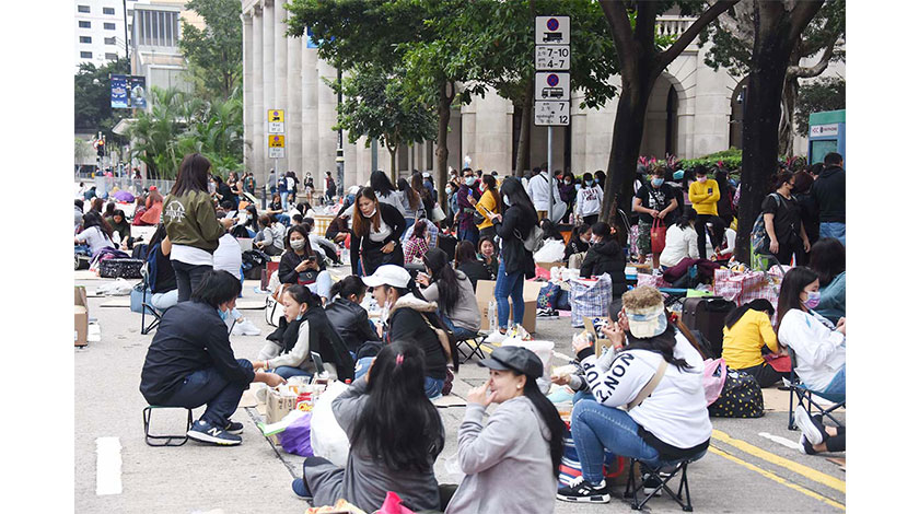 12月16日,香港特區政府將會為全港外籍家庭傭工,提供一次免費社區檢測,12月17日起可以預約,2至3日內會有檢測結果,免費檢測服務由12月18日至明年1月底。當天,香港衛生防護中心傳染病處主任張竹君仔在記者會上說,外傭也可以到郵局等地點領取深喉唾液檢測瓶,呼籲外傭如有不適,要盡快求醫。圖為假日在中環集聚的外籍家庭傭工。(香港中通社)