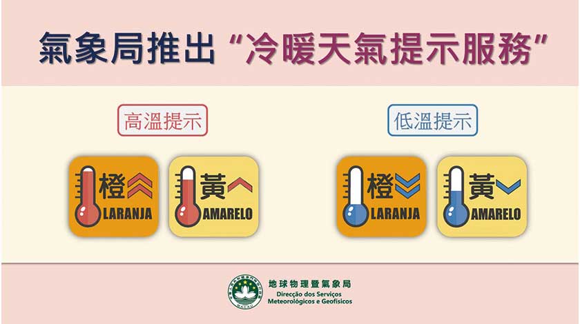 “冷暖天氣提示服務”是綜合考慮本澳出現酷熱和寒冷天氣的程度、持續時間和頻率來制定,目的在酷熱〈黃色高溫提示〉或非常酷熱〈橙色高溫提示〉天氣發生前,提早發出對應的高溫提示,提醒公眾預早做好消暑避暑措施;而當寒冷〈黃色低溫提示〉或非常寒冷〈橙色低溫提示〉天氣來襲時,提早發出提示,避免公眾因為寒冷天氣而影響健康。
