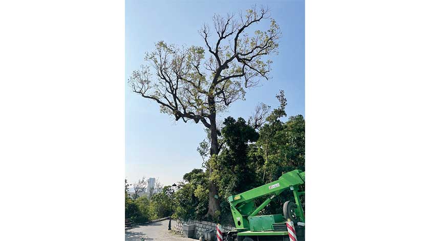 【特訊】市政署於早前發現松山市政公園一株古樟樹的樹基和樹根多處呈碎木及軟腐狀態,整體生長亦呈下降趨勢,故對其樹冠枯枝進行修剪,並計劃加設支撐架,持續監察該樹狀況。