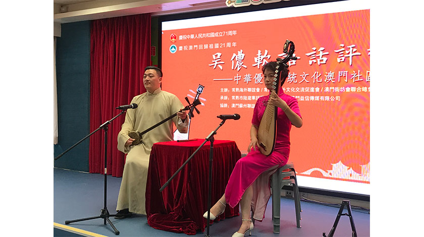 【本報訊】為慶祝中華人民共和國成立七十一週年、澳門特別行政區成立廿一週年,常熟海外聯誼會、常熟市對外文化交流促進會組織評彈藝術家來澳,首次聯袂澳門街坊總會於社區服務大樓昨、今一連兩天舉辦“吳儂軟語話評彈——中華優秀傳統文化澳門社區行”評彈藝術品鑒活動。藉以促進澳門、常熟兩地文化交流,推動中華優秀傳統文化在澳門的傳承和推廣,宣傳好中華優秀傳統文化。