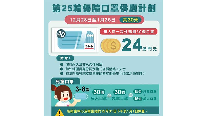 【本報訊】疫苗供澳前都不會檢討中止的保障口罩供應澳門居民計劃,將於下周一(廿八日)起開始新的第廿五輪,一次廿四元買三十個、兒童口罩供應等維持不變。