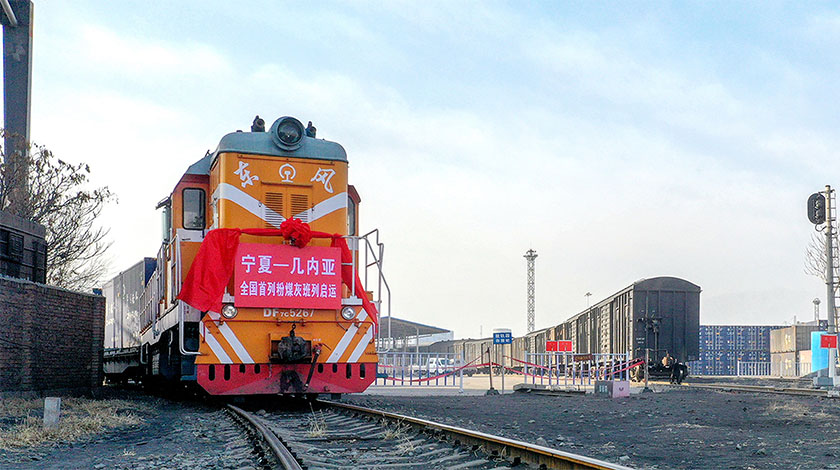 23日,滿載40個集裝箱、貨重1280噸的粉煤灰多式聯運出口班列23日由寧夏石嘴山發出,經太中銀線到達煙台港,自煙台港裝船運輸至非洲几內亞。據悉,這是寧夏第一次以國際班列多式聯運形式發運非洲國家,也是中國第一次實現粉煤灰整列出口。圖為整裝待發的班列。(中新社發 賴盛龍 攝)