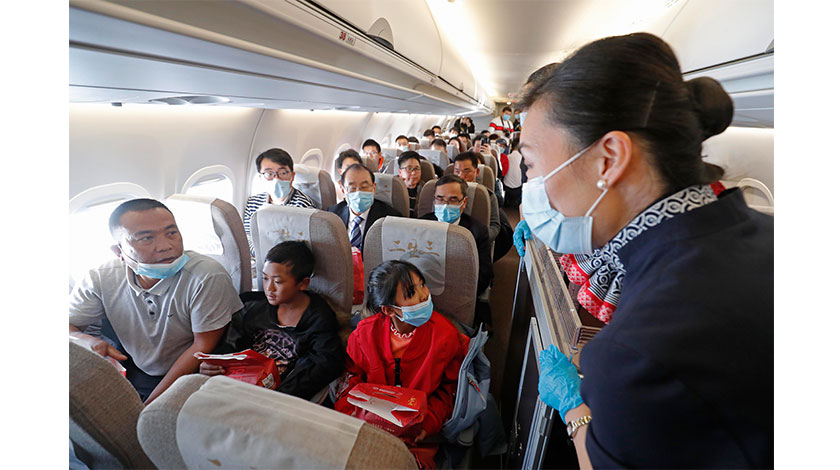 12月28日,東航今年新成立的一二三航空有限公司引進的首架ARJ21飛機執行MU5159航班,以超過90%的客座率正式開啟首航之旅。飛機于當日14:25分從上海虹橋機場起飛,飛向北京首都機場。圖為乘務員為旅客服務。(中新社記者 殷立勤 攝)